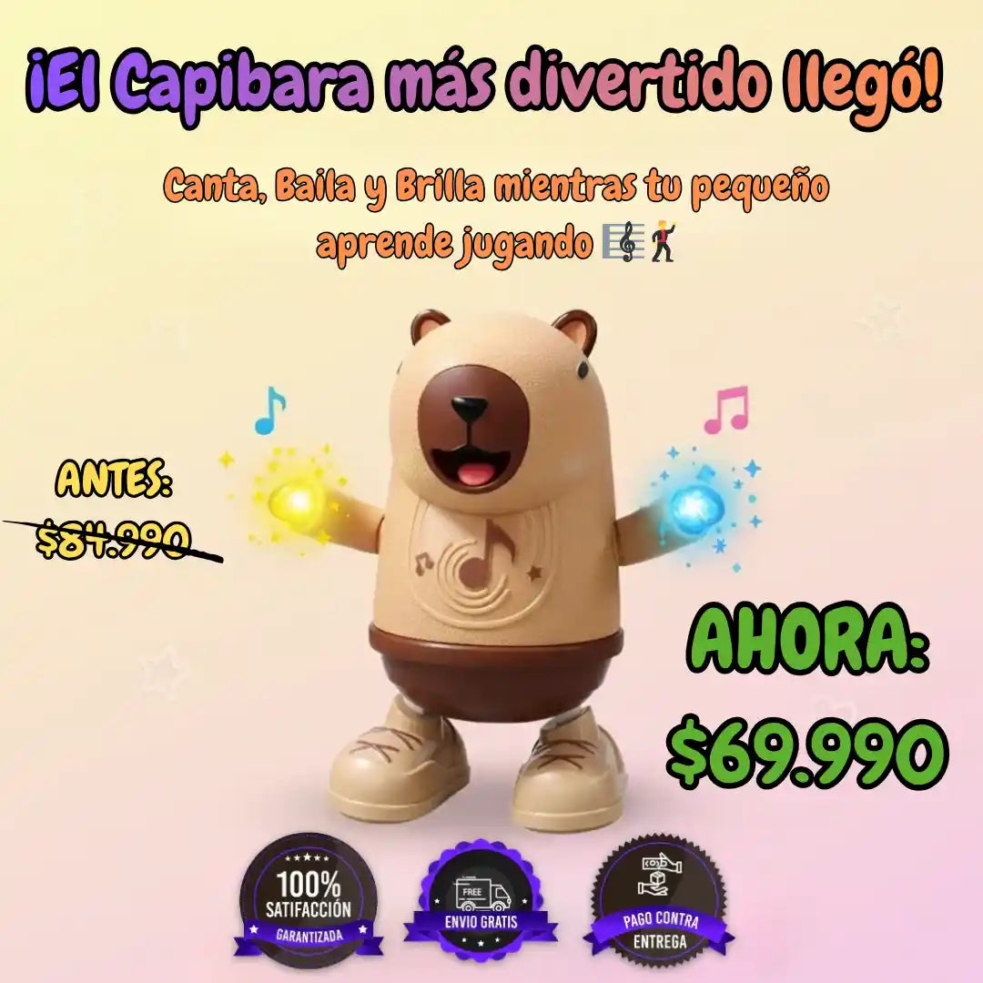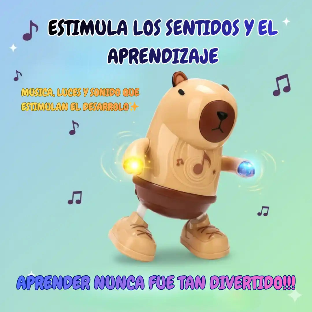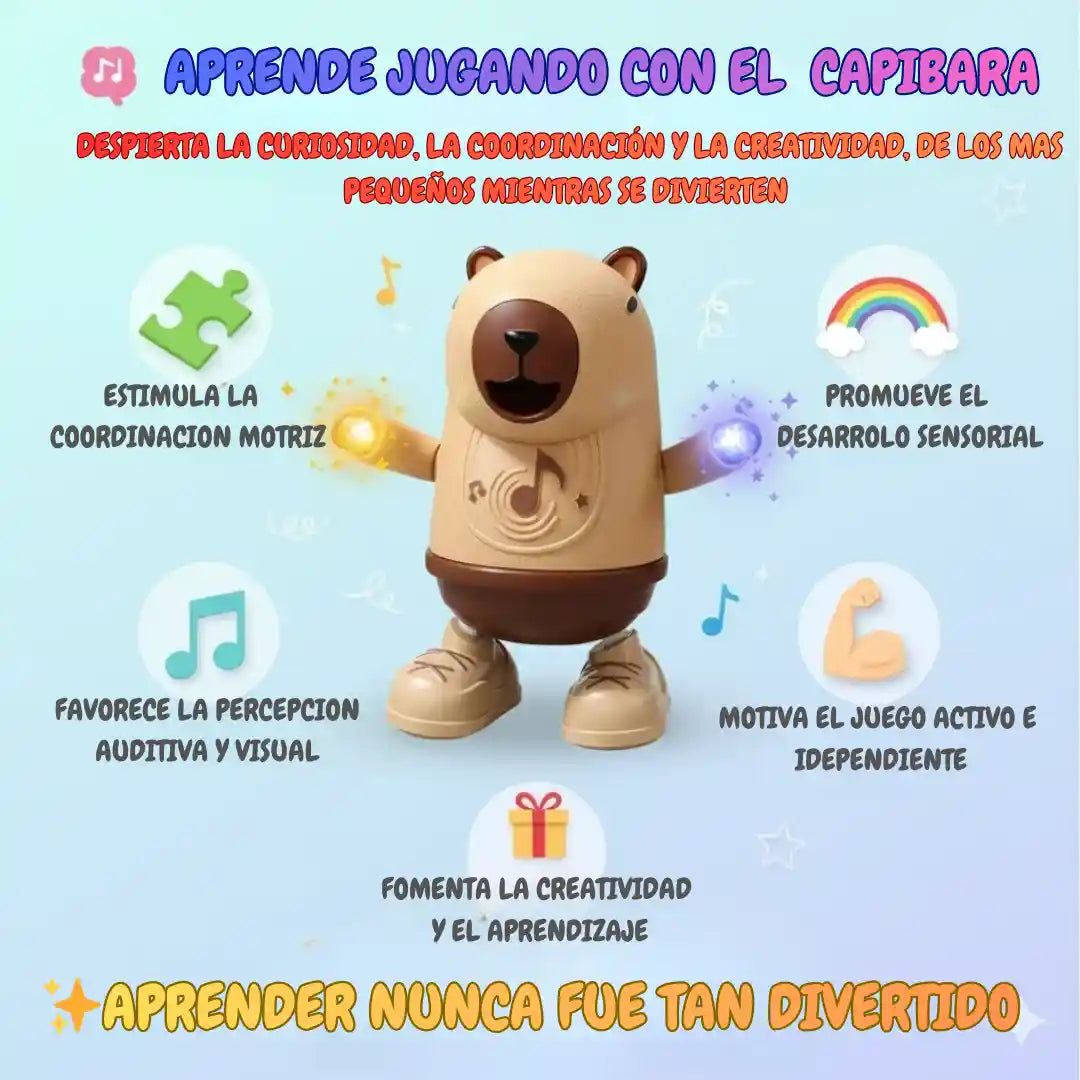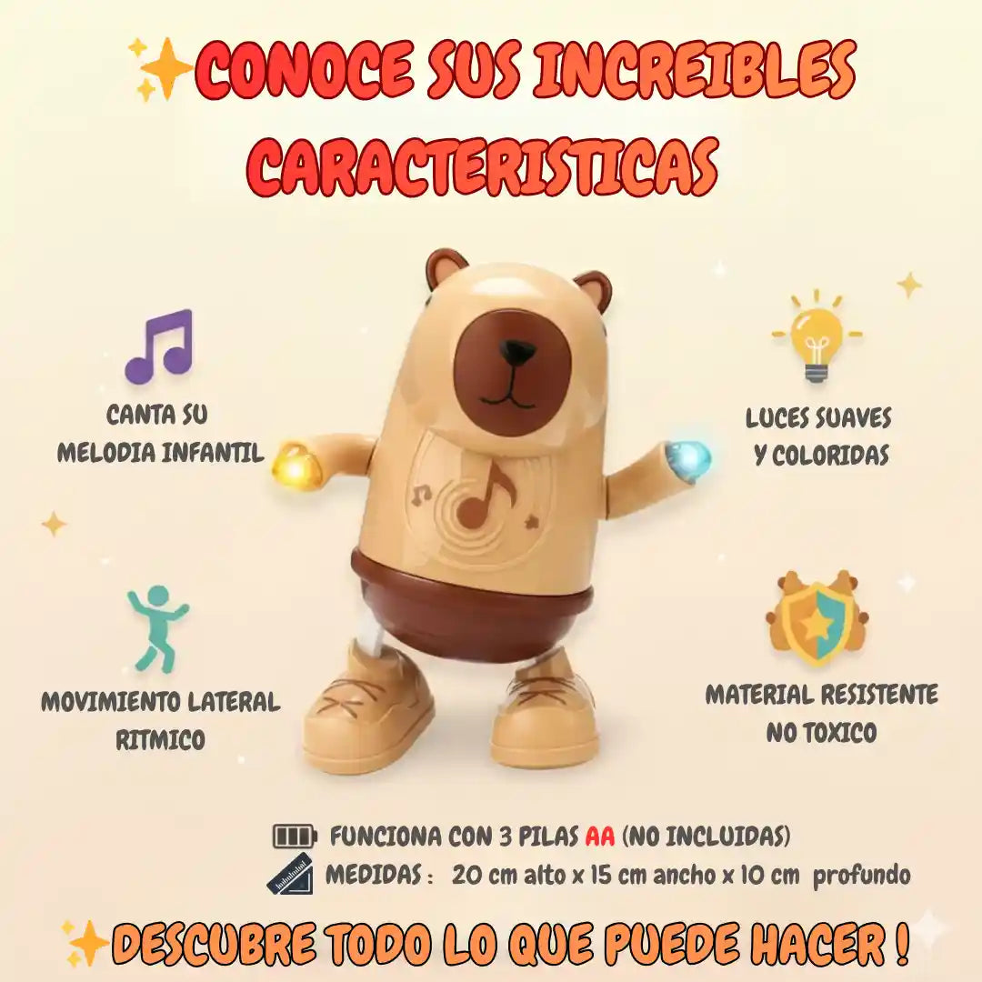 El Capibara se mueve automáticamente 🎶💃. Solo debes encenderlo con el botón de encendido, y comenzará a bailar de un lado a otro mientras canta y emite luces suaves. ¡Ideal para mantener a los niños entretenidos y felices!